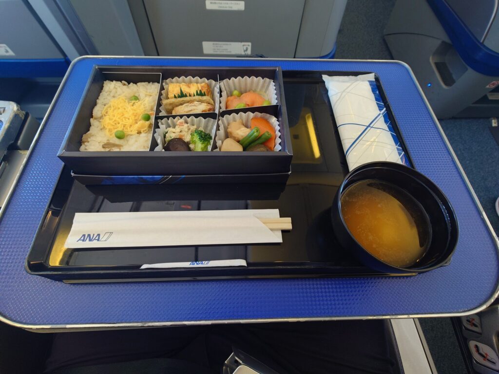 10時発という、少し遅めの出発。シートに身を委ねてしばらくすると、プレミアムクラスならではの「朝食」が運ばれてきます。箱を開けた瞬間に広がる、彩り豊かな季節の味。