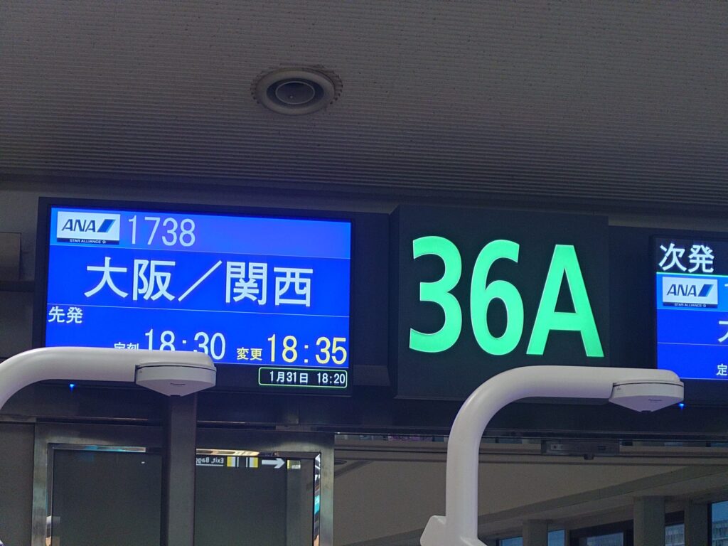 さて、残すところも最後の便の大阪・関西行になります。3レグ目も10分~15分の遅延があり、乗り継ぎまであまり時間がありません。今回は少しだけスマホの充電をしにラウンジに立ち寄り、足早にゲート前に来たものの、最後の便も遅延です。