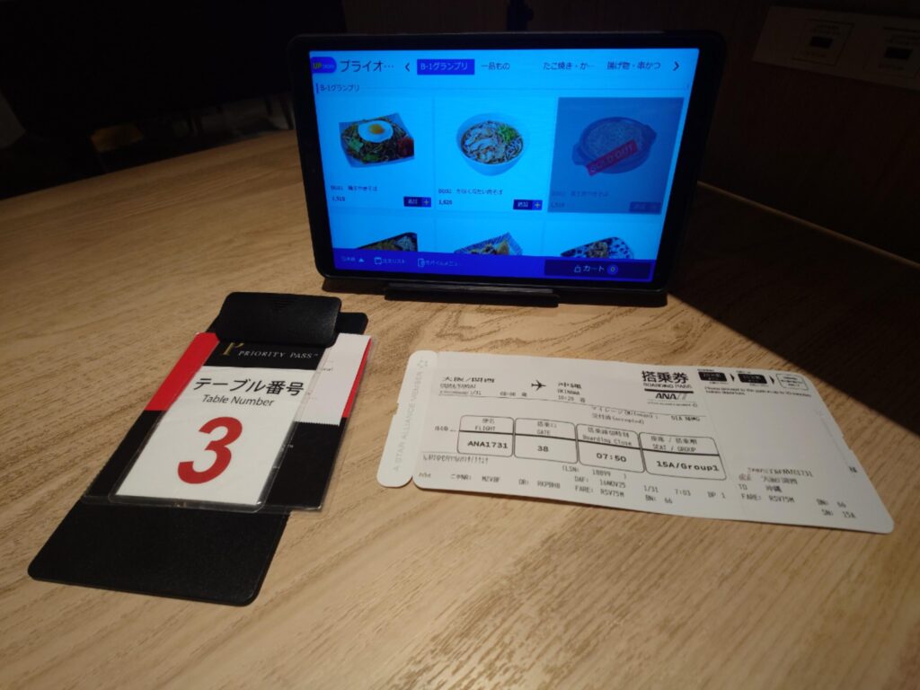 受付後専用の番号札を受け取り着席。注文はタブレット端末から。「B-1グランプリ」メニューなど豊富なラインナップがあります。今回のようなフライト(08:00発・那覇行き)まで時間がない時でも、サクサク注文できるのは高評価です。