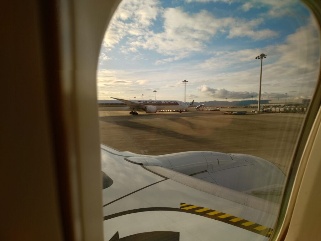 ターミナルの喧騒から離れた場所にひっそりと駐機(沖止め)されている、シンガポール航空の機体。 これから私が乗るANAの国内線とは違う、遠い異国の空気感をまとったその姿に、少しだけ旅情を刺激されました。