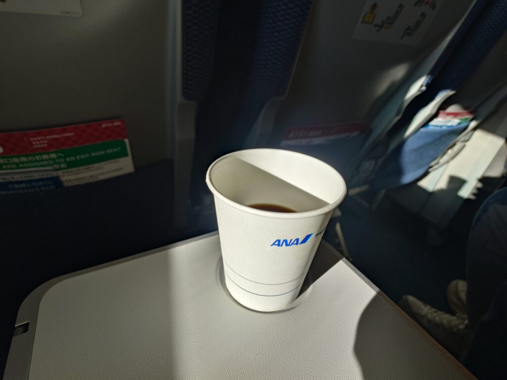 無事に離陸し、安定飛行に入ると、CAさんがコーヒーを持ってきてくれました。美しい雲海を眺めながらの、至福のコーヒータイム。この時間がたまらなく好きです。