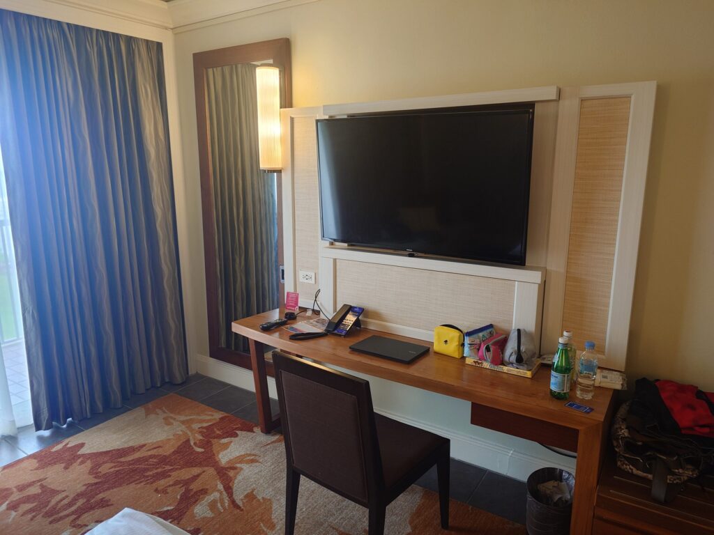 一通り、お部屋をチェックした後はデスクにPCを出してしばしば作業タイム。この距離感でのTVの大きさは少々バグってる感がありますが皆さんは海外でTVてご覧になりますか?
