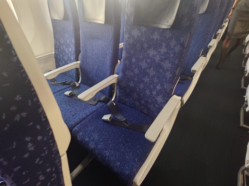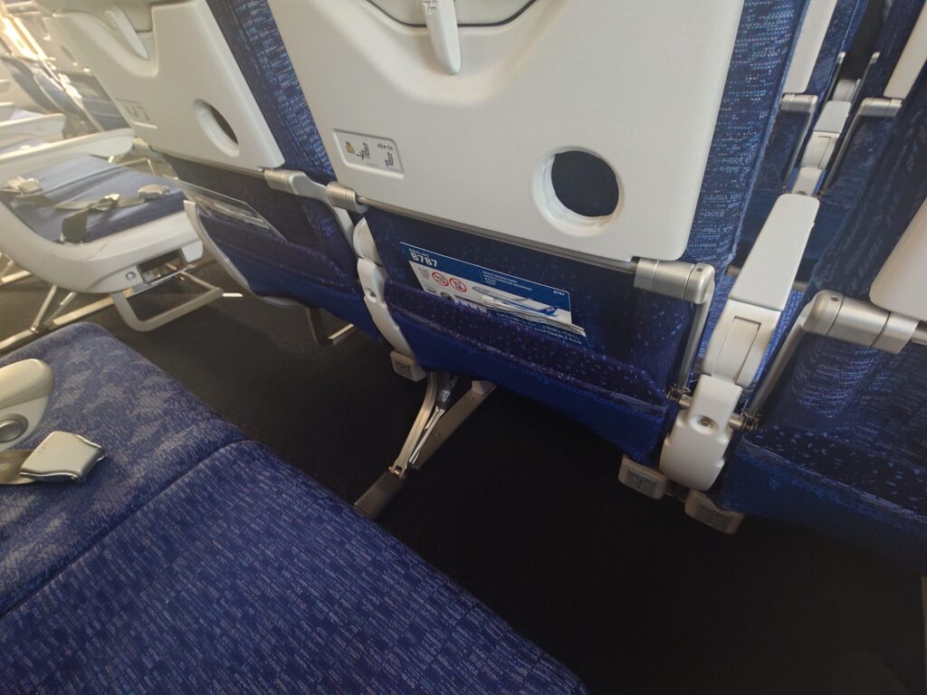 身長175cmの私が座ると、787特有の機体形状(壁の湾曲)も相まって、特に窓側はかなりの圧迫感を感じます。 最新機材で装備が充実している分、空間的な「ゆとり」については、以前の大型機に軍配が上がるのが正直なところ。777-200ER(722)はそれなりに広く感じるのですが。