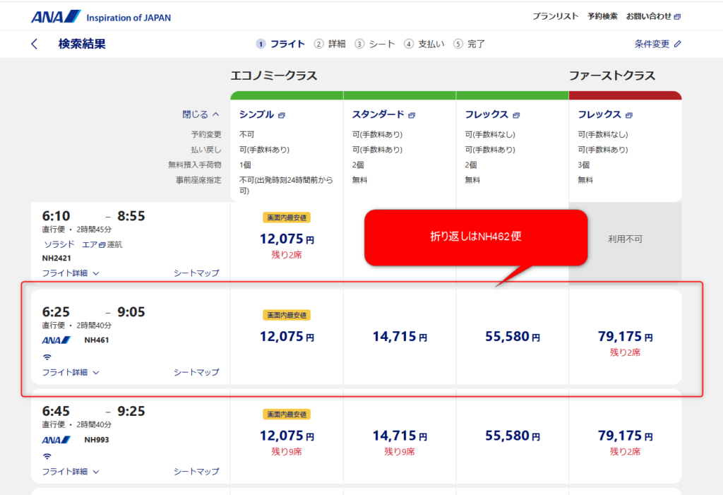 私を含め、多くのマイラーが実機検証を繰り返した結果、驚くべき事実が判明しました。 朝一番のNH461便(06:25発)を予約し、その折り返しとなるNH462便(11:30頃発)を往復で検索しても、462便は一切表示されません。しかし、復路を「到着から3時間以上」の便に変更した途端、何事もなかったかのように検索結果に現れるのです。