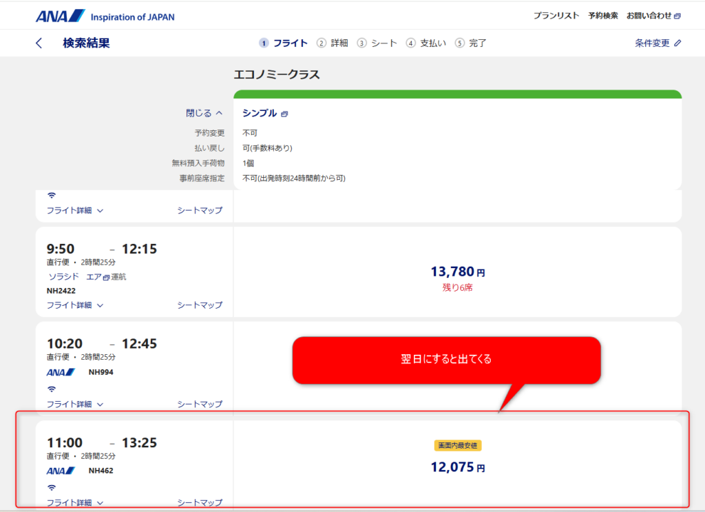 ※朝一の便だと再現性がないので、遅めの時間帯の便で検索し検証し結果です