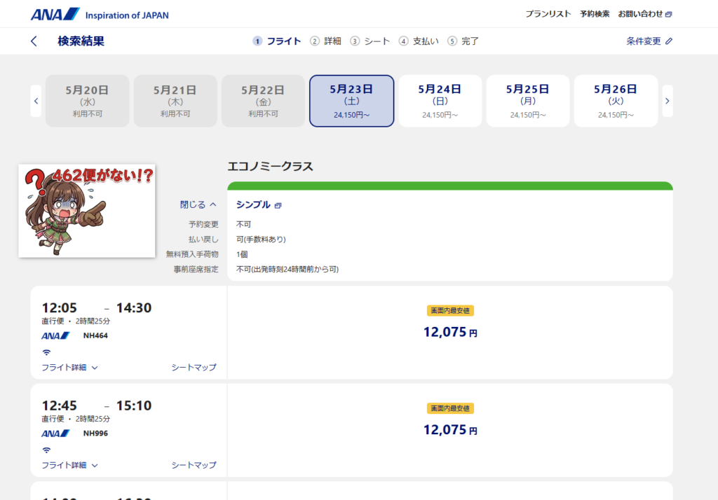 「……あれ? 461便は取れるのに、折り返しの462便が出てこない!?」