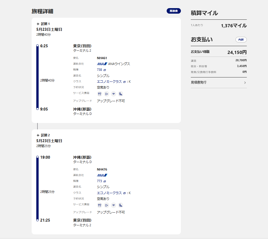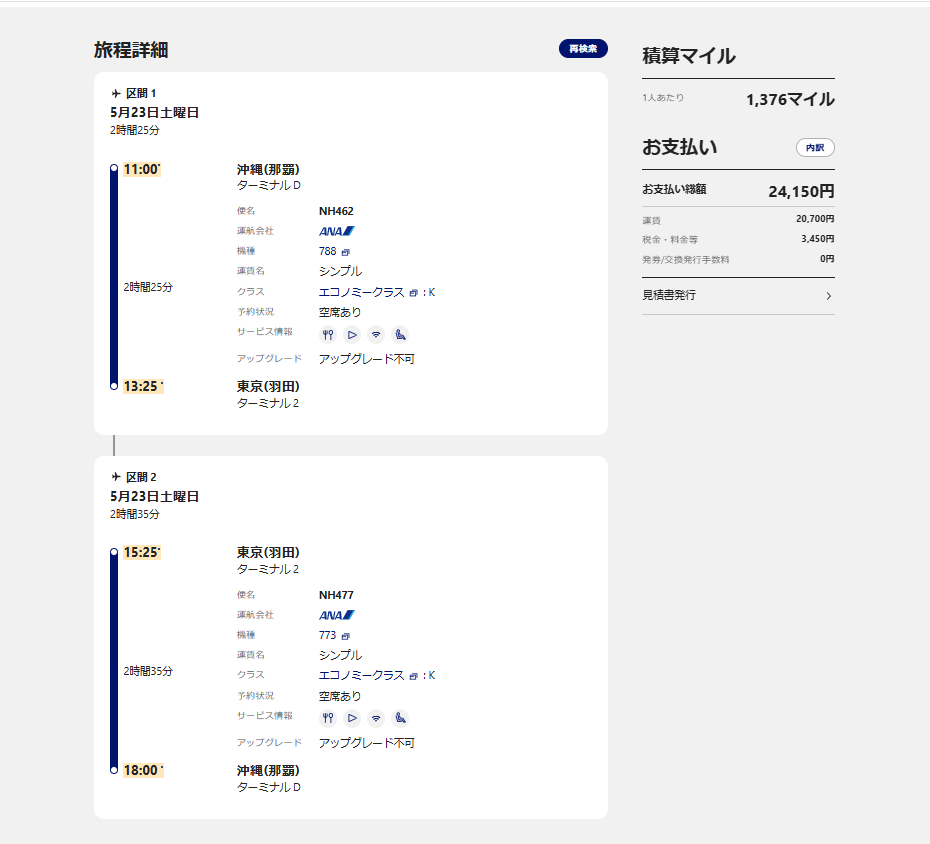 • 予約 A(1枚目の往復券): 【往路】5月23日 NH461(06:25発) + 【復路】別の日(後日など)