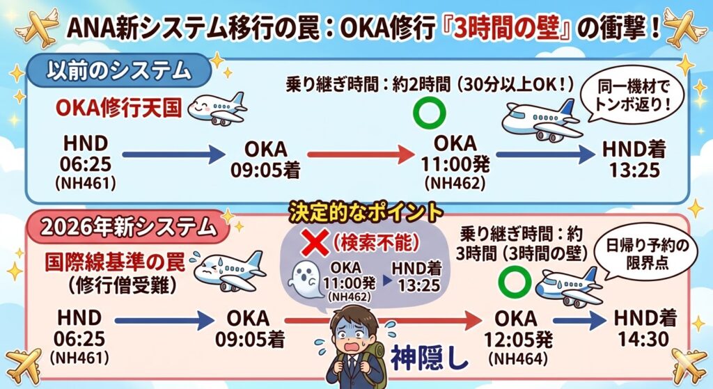 2026年、ANAの新システム移行に伴い、私たちの「修行」の常識がガラガラと音を立てて崩れ去りました。 いつものように、朝一番のNH461便(羽田 06:25発)から、その折り返しとなるNH462便(那覇 11:30頃発)へと繋ぐ、あの日帰り往復を予約しようとしたその時です。