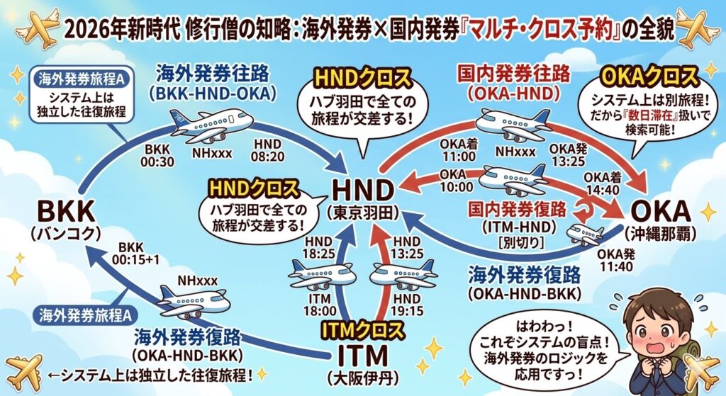 システムが「往復一括予約」という狭い枠組みでしか私たちを判定しないのであれば、私たちは複数の旅程を戦略的に組み合わせることで、その枠を飛び越えるしかありません。