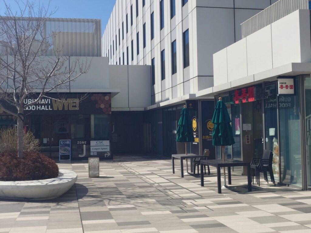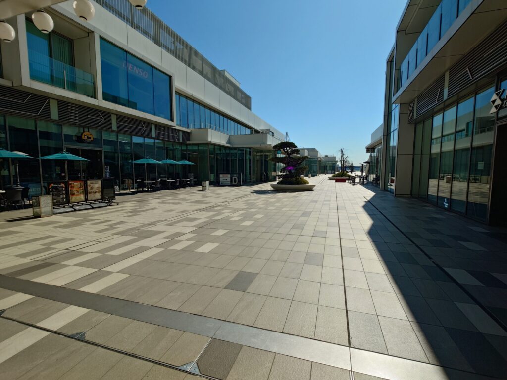 時刻は午前10時過ぎ。本来なら週末のレジャーを楽しむ人々で賑わい始めてもおかしくない時間ですが、どこを切り取っても「無人」の風景が続きます。新しくて綺麗な街並みが、かえってその静寂を際立たせているようです。
