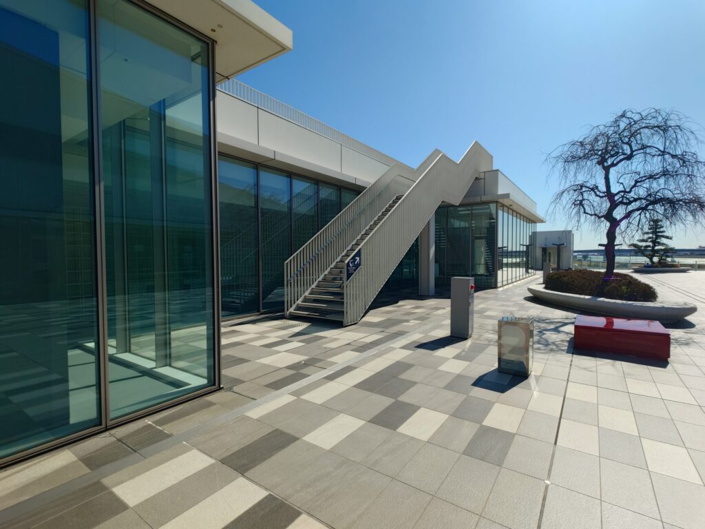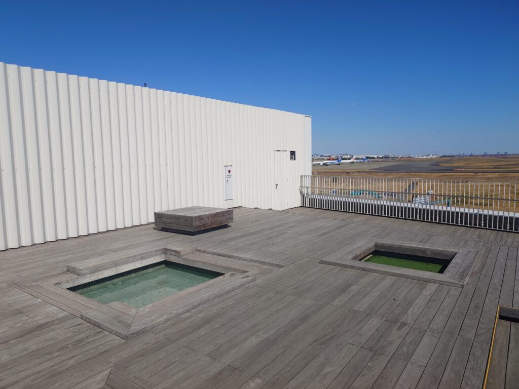 建物の上層階にある「足湯スカイデッキ」に到着しました。羽田空港の滑走路を一望できる、本来ならこの施設で最も人気があるはずの場所です。ところが、目の前に広がっていたのは、人っ子一人いない「完全貸切」の空間でした。