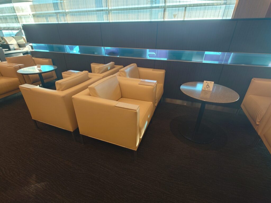 ラウンジ内は、早朝らしい落ち着いた空気が流れています。窓の外には、これから私を運んでくれる翼たちが朝日を浴びて並んでいます。